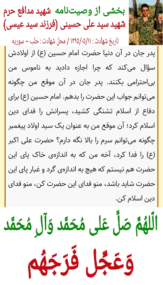 پدر جان در آن دنیا حضرت امام حسین (ع) از اولادش سؤال میکند که چرا اجازه دادید به ناموس من بیاحترامی بکنند. پدر جان در آن موقع من چگونه میتوانم جواب این حضرت را بدهم. امام حسین (ع) برای دفاع از اسلام تشنگی کشید، پسرانش را فدای دین اسلام کرد؛ آن موقع من به عنوان یک سید اولاد پیغمبر چگونه میتوانم سرم را بالا نگه دارم؟ حضرت علی اکبر (ع) را فدا کرد، آخه من که به اندازهی خاک پای این حضرت هم نیستم که هیچ به اندازهی گرد و غبار پای این حضرت شاید باشد، منو فدای این حضرت کن، منو فدای دین اسلام کن.