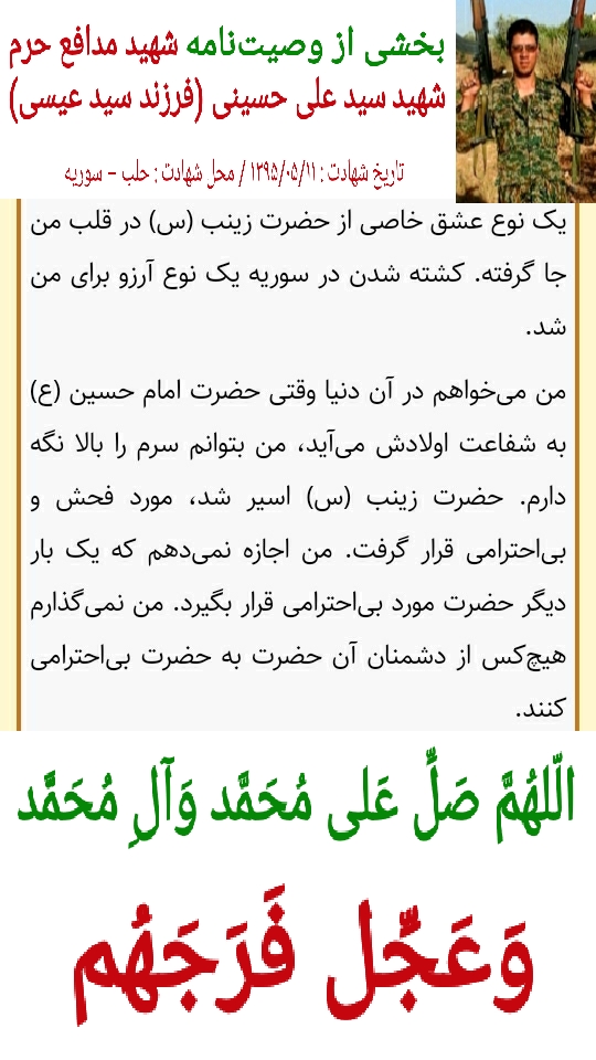 یک نوع عشق خاصی از حضرت زینب (س) در قلب من جا گرفته. کشته شدن در سوریه یک نوع آرزو برای من شد.