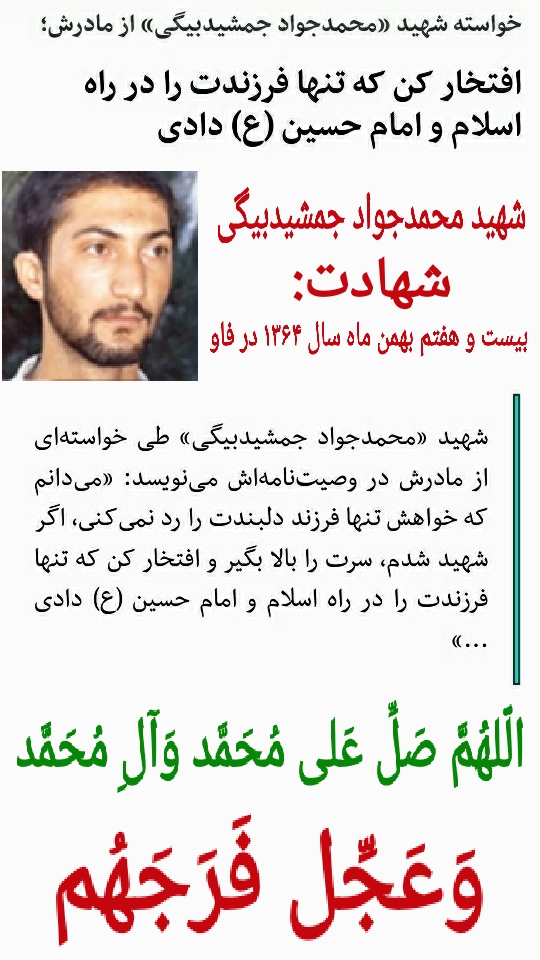 شهید «محمدجواد جمشیدبیگی» طی خواستهای از مادرش در وصیتنامهاش مینویسد: «مىدانم که خواهش تنها فرزند دلبندت را رد نمىکنى، اگر شهید شدم، سرت را بالا بگیر و افتخار کن که تنها فرزندت را در راه اسلام و امام حسین (ع) دادى ...»