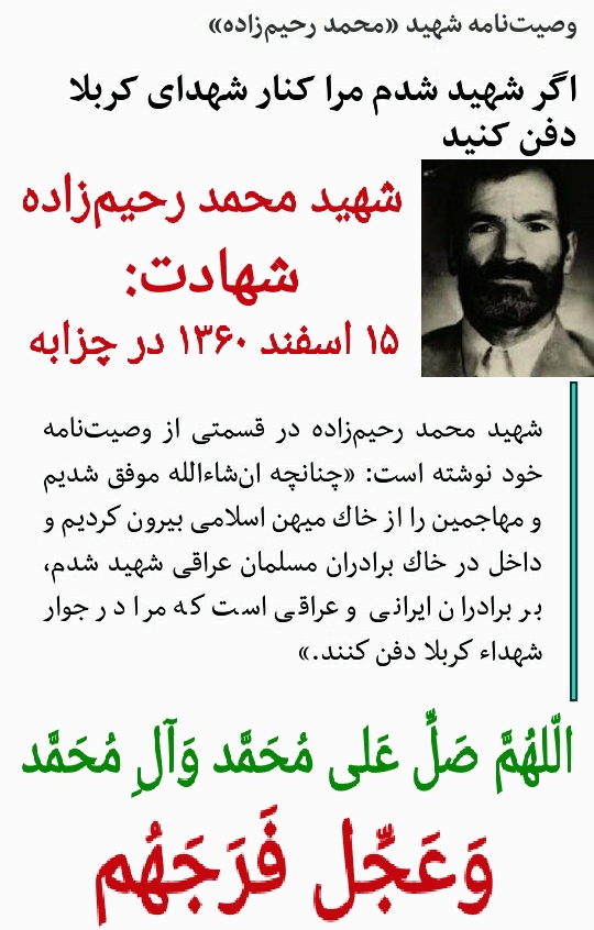 امیدوارم آن راه که رفتم در رابطه با الله بوده باشد و از تکتک شماها که برایم دلسوزی میکنید تقاضا دارم در مرحله اول دینم، قرآن و وحدت و یکپارچگی را حفظ کرده و راهی که حسین سرور آزادمردان جهان و شیر زنان دنیا رفتهاند ادامه دهید و نگذارید هدف آنها که به پا داشتن اسلام عزیز است پایمال و یا از بین برود. از شما میخواهم این انقلاب که با ریختن خون 10 هزار شهید به دست آمده است از دست ندهید و وحدت و یکپارچگی آن را به ثمر برسانید با رهبری امام خمینی ...