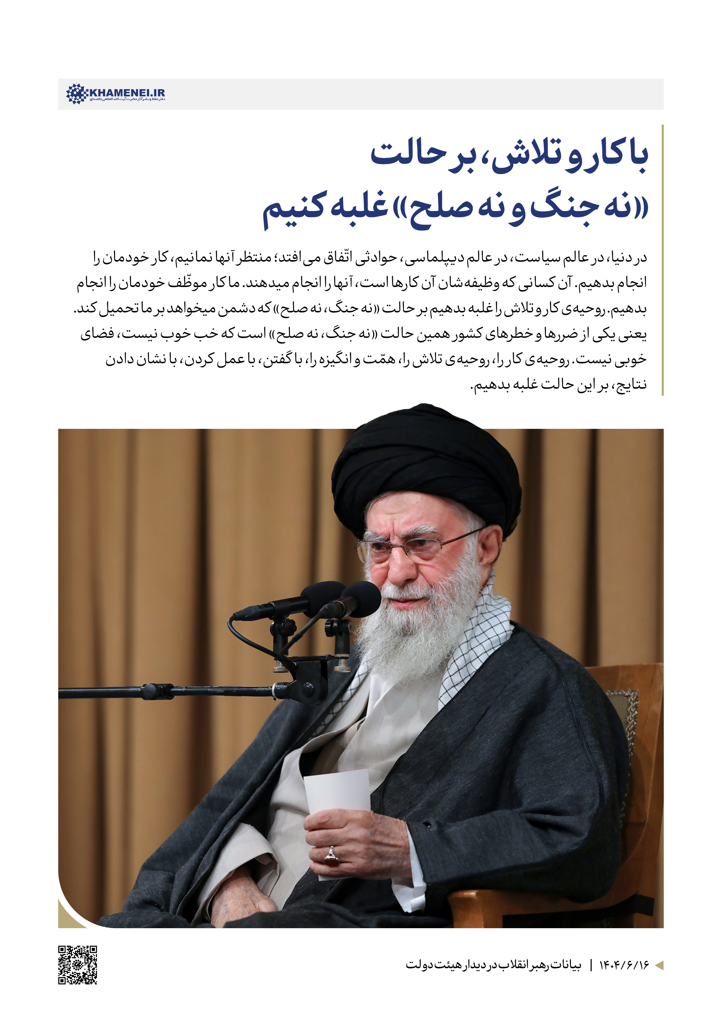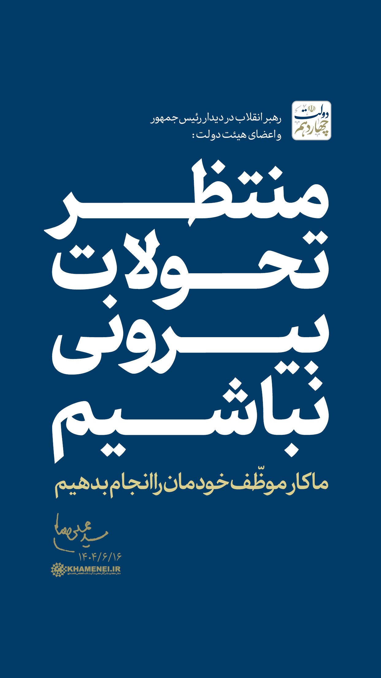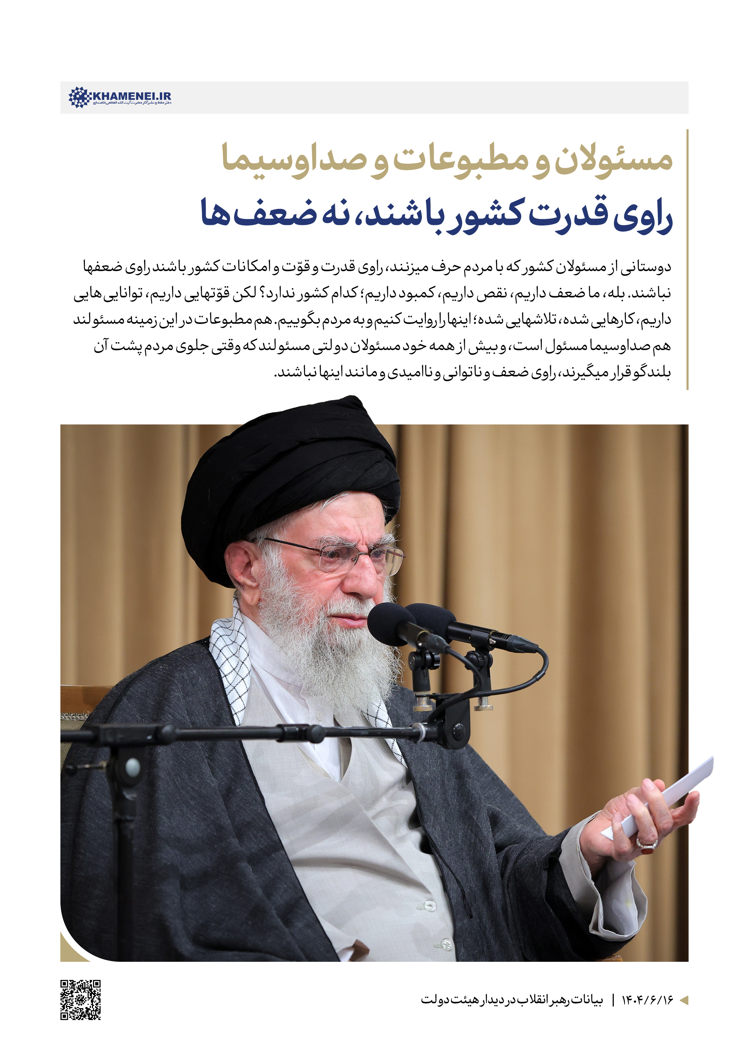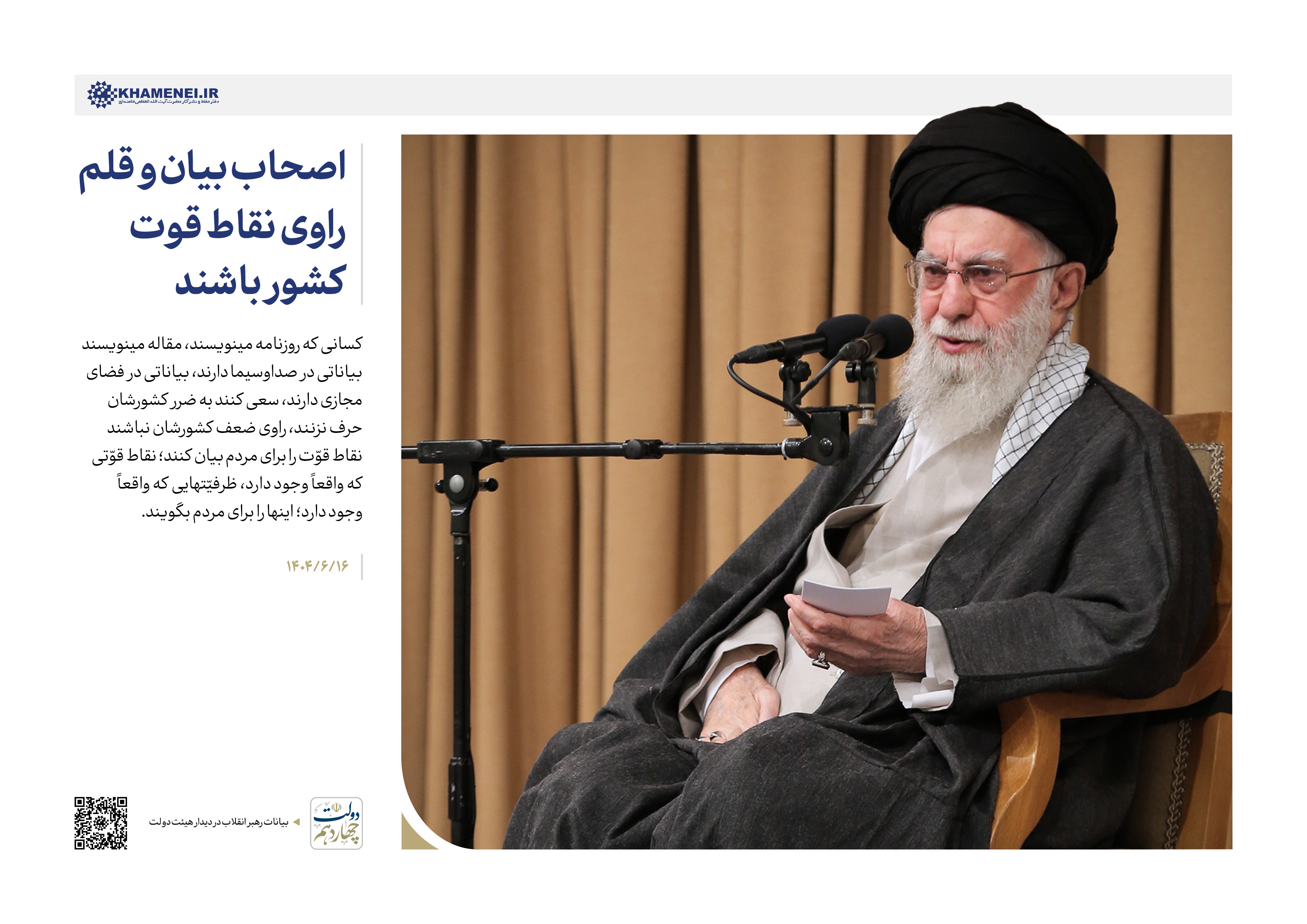 حضرت آیتالله امام خامنهای: «وظیفهی مهمّ دولتها تقویت مؤلّفههای قدرت ملّی و عزّت ملّی است. در همهی دنیا اینجور است که وظیفهی همهی دولتها این است که مؤلّفههای قدرت ملّی را تقویت کنند که مهمترین آنها روحیه و انگیزه و یکپارچگی ملّت است؛ یعنی از مؤلّفههای قدرت ــ اگر چنانچه بخواهیم شماره کنیم ــ مهمترینش همین است که ملّت یکپارچه باشد، باروحیه باشد، امیدوار باشد، باانگیزه باشد. ما در کارکرد خودمان، در حرف زدن خودمان، در پایبندیمان به وظایف خودمان بایستی این روحیه را در ملّت به وجود بیاوریم و اگر وجود دارد، تقویت کنیم و مانع بشویم از زوال آن روحیه.» ۱۴۰۴/۰۶/۱۶