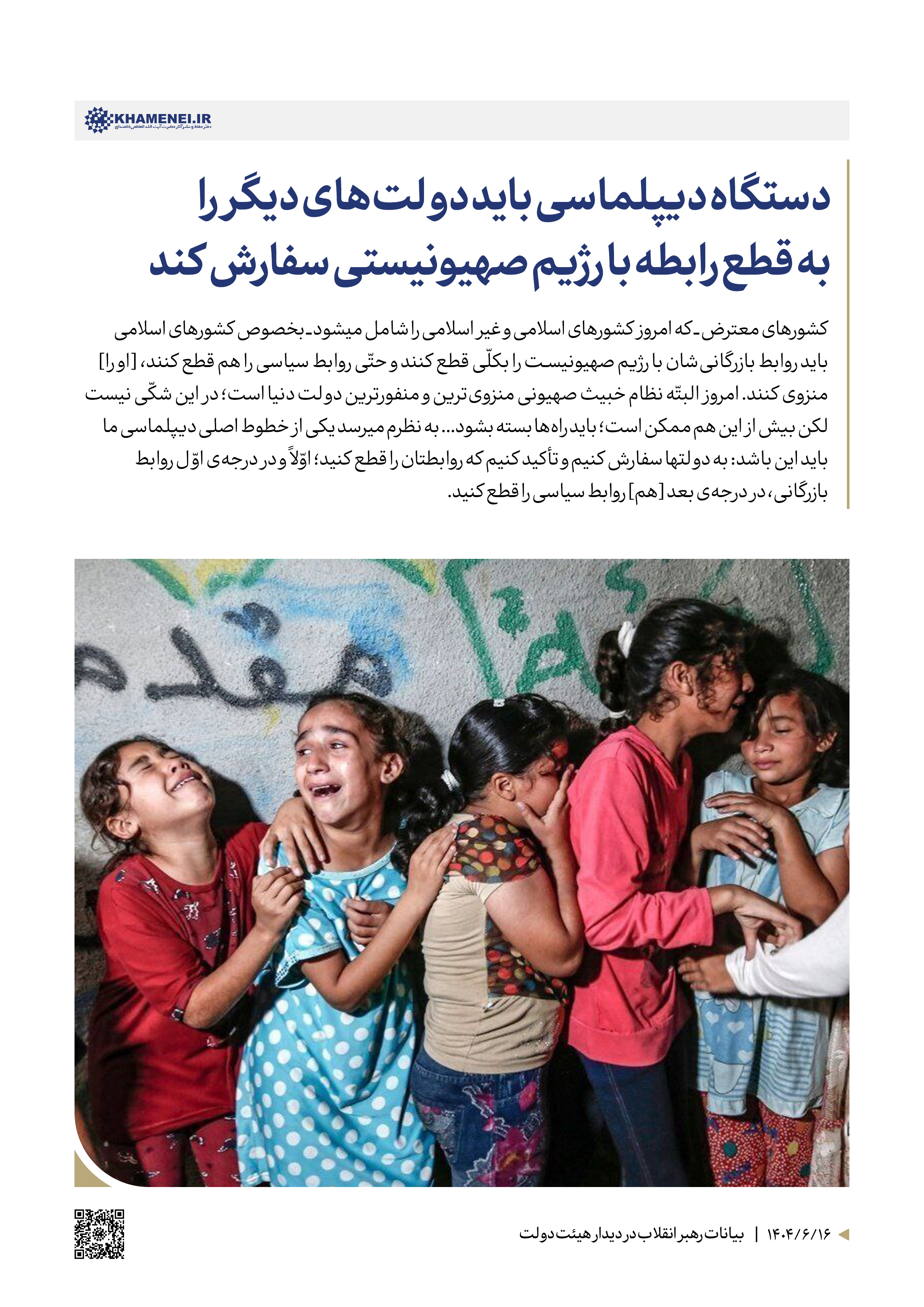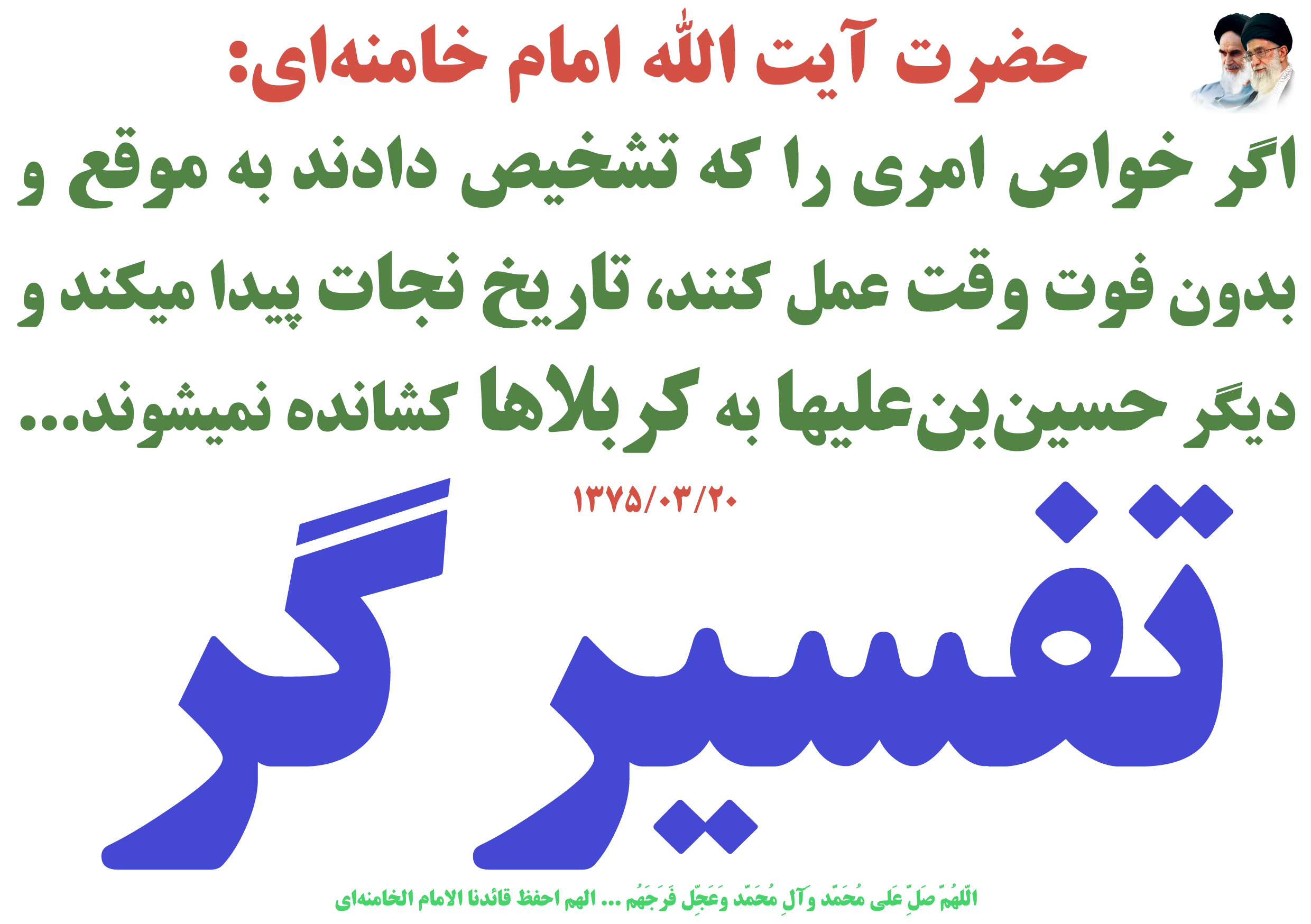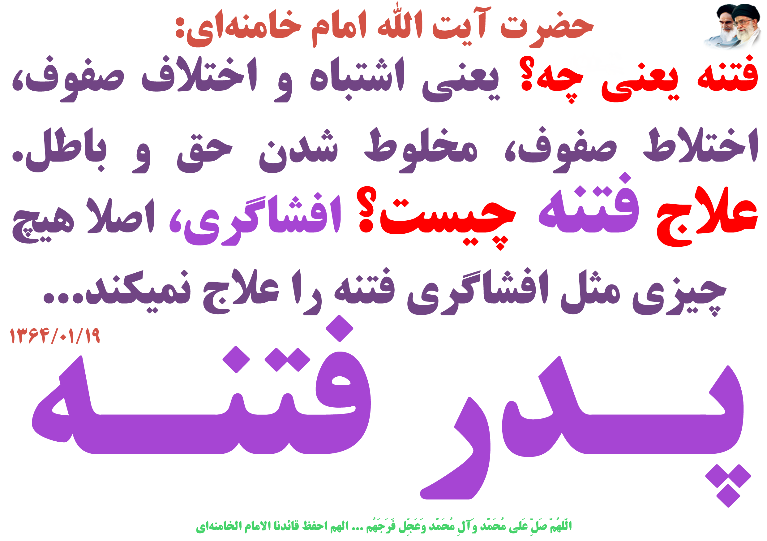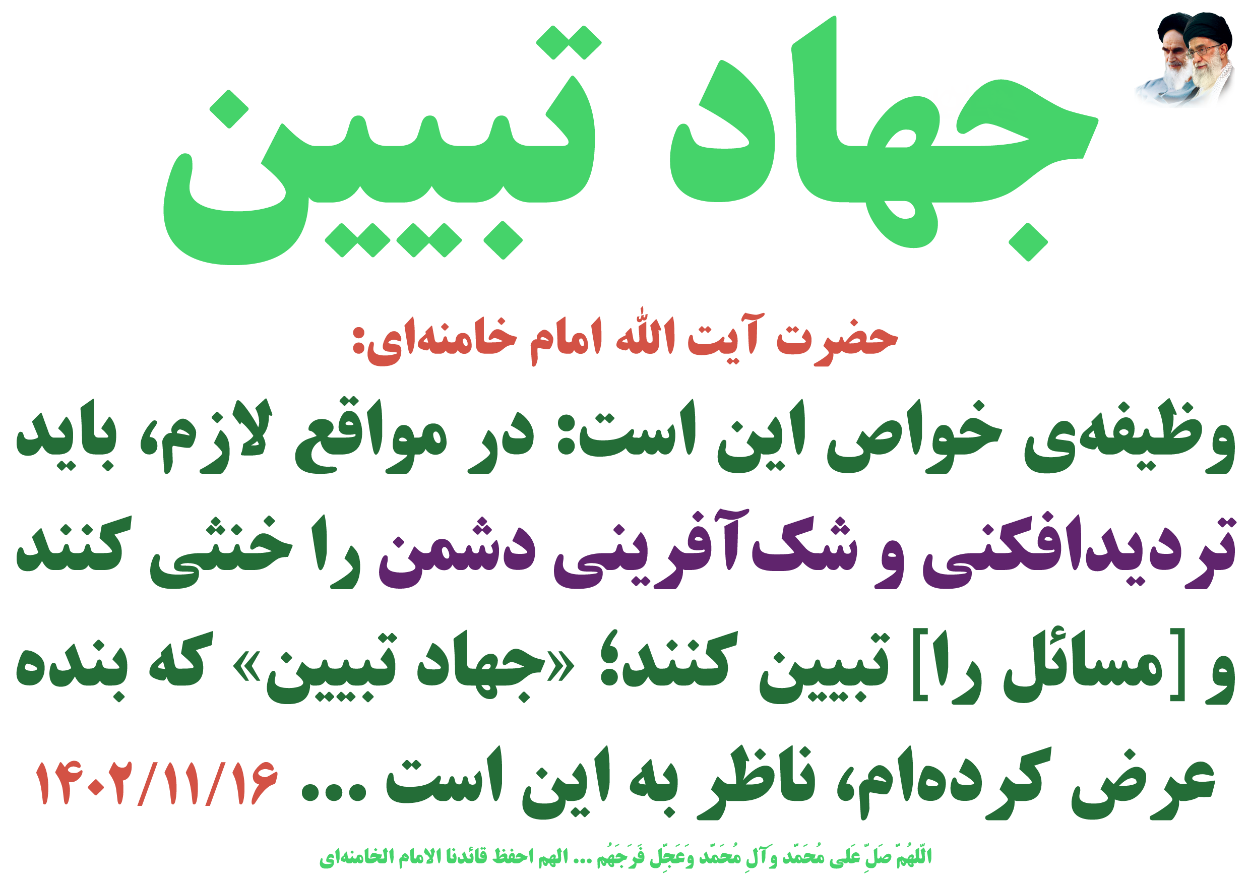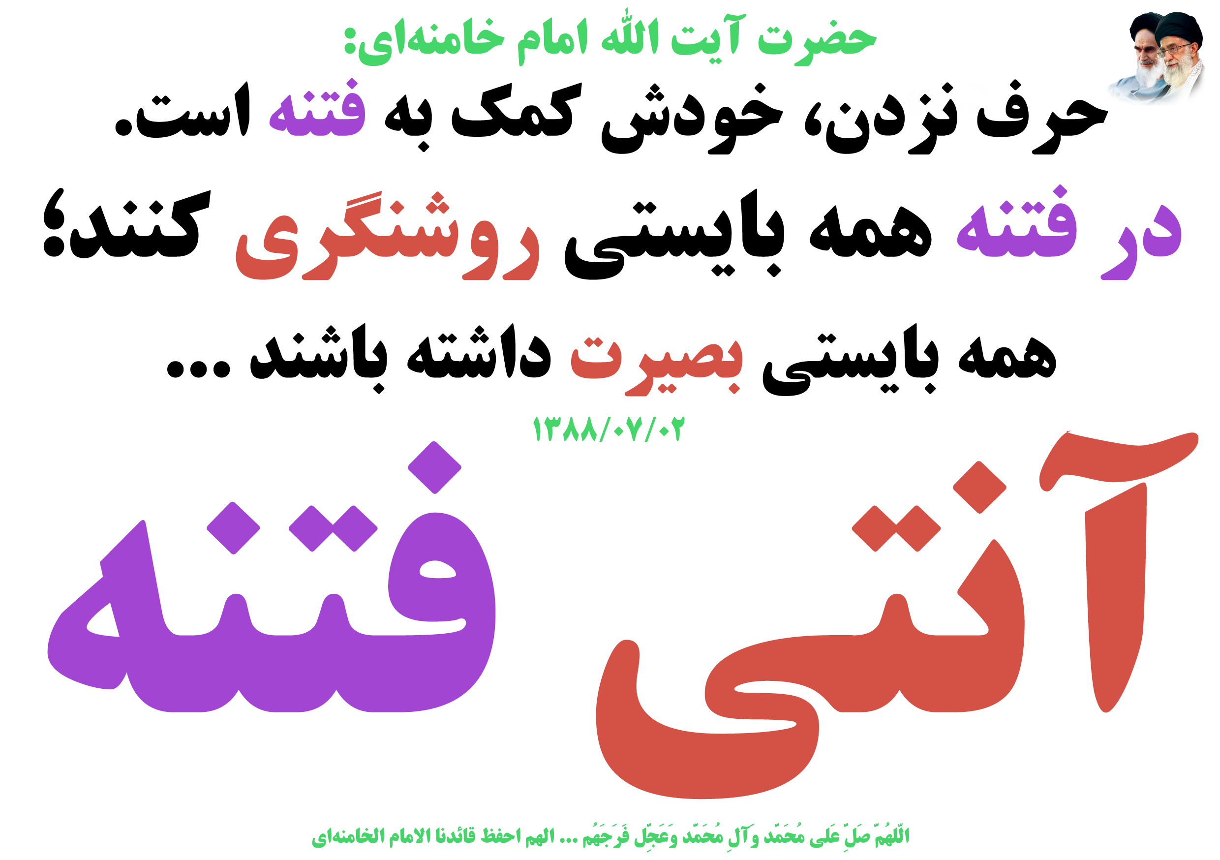 حضرت آیتالله امام خامنهای: «وظیفهی مهمّ دولتها تقویت مؤلّفههای قدرت ملّی و عزّت ملّی است. در همهی دنیا اینجور است که وظیفهی همهی دولتها این است که مؤلّفههای قدرت ملّی را تقویت کنند که مهمترین آنها روحیه و انگیزه و یکپارچگی ملّت است؛ یعنی از مؤلّفههای قدرت ــ اگر چنانچه بخواهیم شماره کنیم ــ مهمترینش همین است که ملّت یکپارچه باشد، باروحیه باشد، امیدوار باشد، باانگیزه باشد. ما در کارکرد خودمان، در حرف زدن خودمان، در پایبندیمان به وظایف خودمان بایستی این روحیه را در ملّت به وجود بیاوریم و اگر وجود دارد، تقویت کنیم و مانع بشویم از زوال آن روحیه.» ۱۴۰۴/۰۶/۱۶