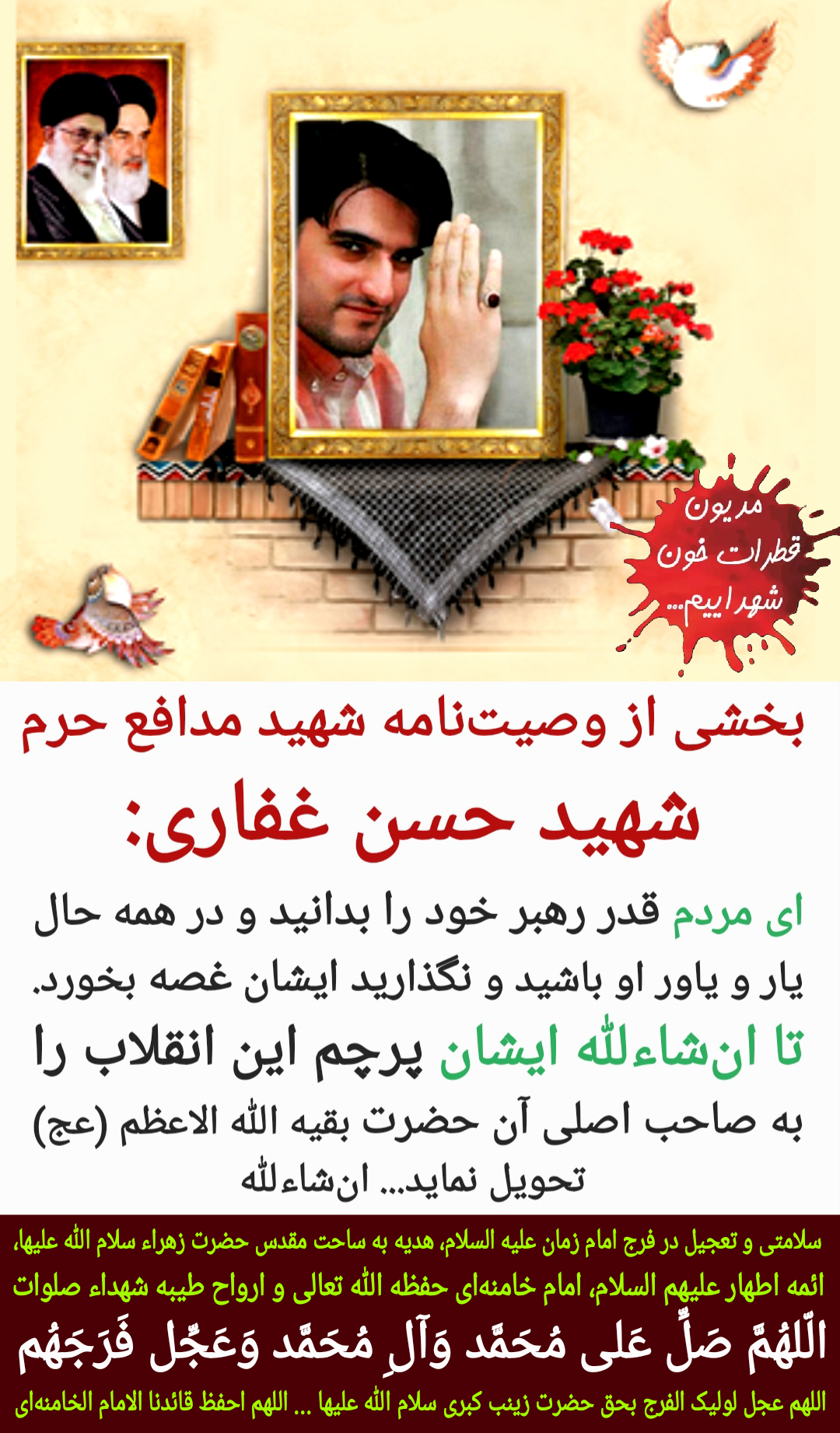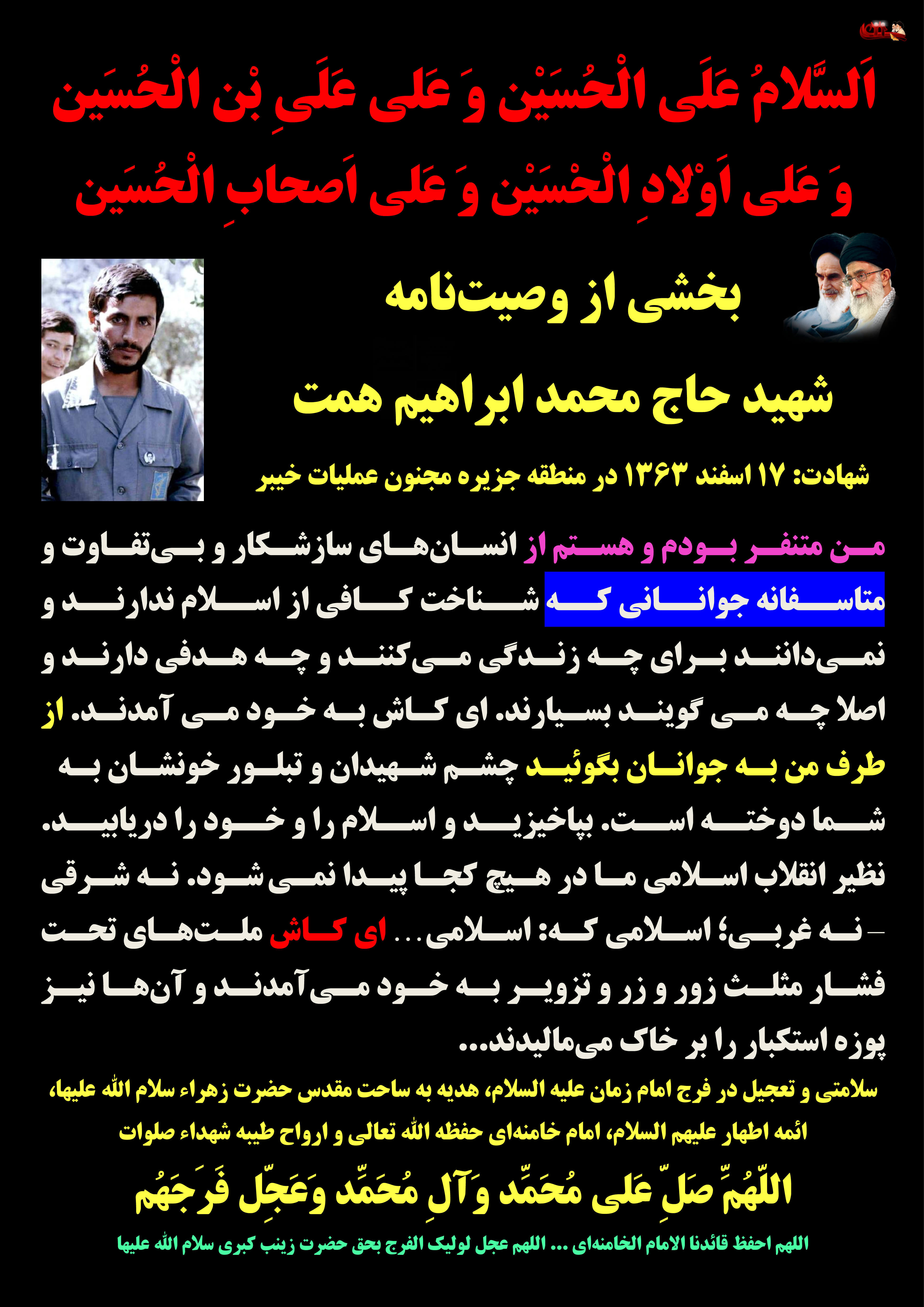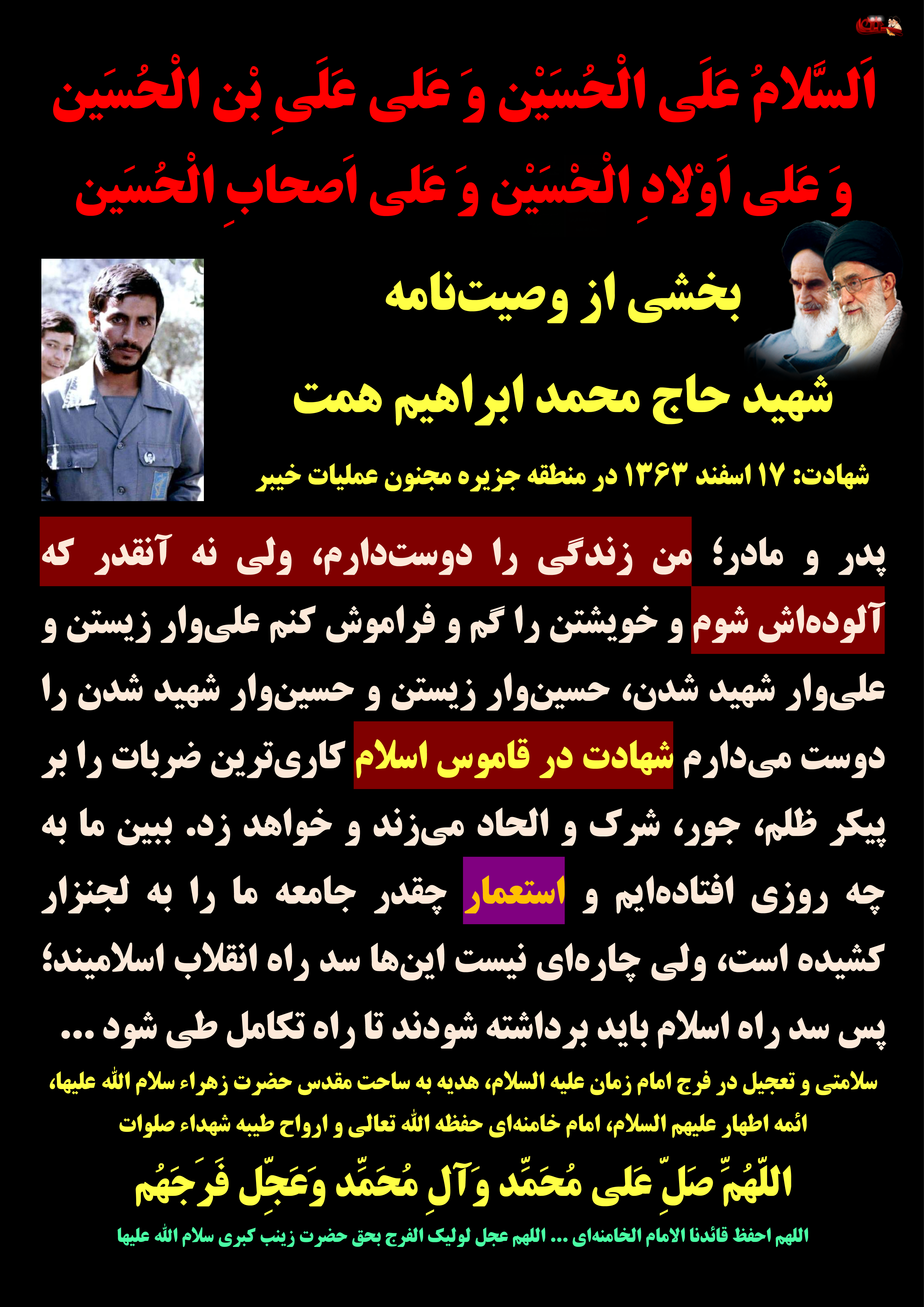 پدر و مادر؛ من زندگی را دوستدارم، ولی نه آنقدر که آلودهاش شوم و خویشتن را گم و فراموش کنم علیوار زیستن و علیوار شهید شدن، حسینوار زیستن و حسینوار شهید شدن را دوست میدارم شهادت در قاموس اسلام کاریترین ضربات را بر پیکر ظلم، جور، شرک و الحاد میزند و خواهد زد. ببین ما به چه روزی افتادهایم و استعمار چقدر جامعه ما را به لجنزار کشیده است، ولی چارهای نیست اینها سد راه انقلاب اسلامیند؛ پس سد راه اسلام باید برداشته شودند تا راه تکامل طی شود ...