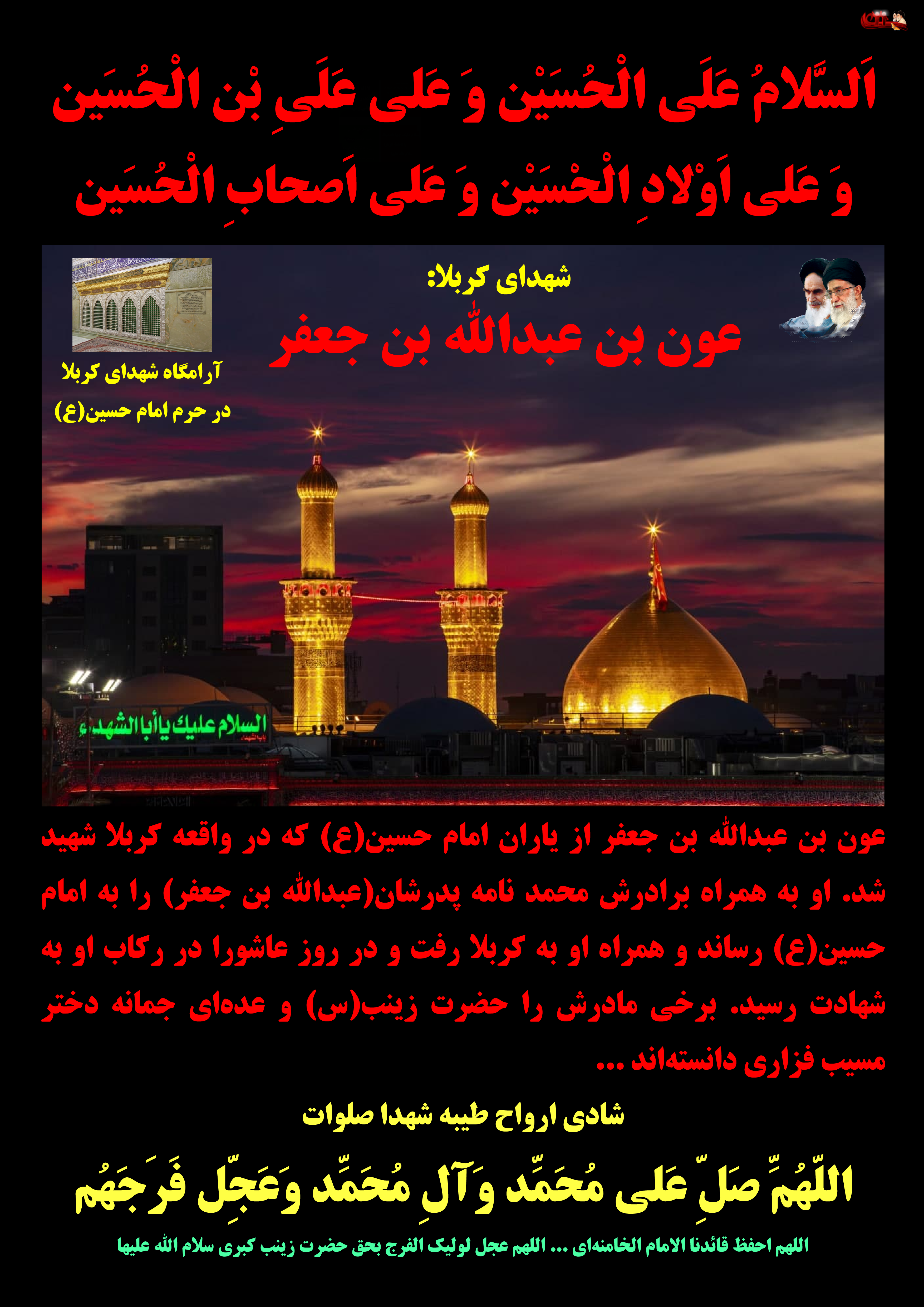 عون بن عبدالله بن جعفر از یاران امام حسین(ع) که در واقعه کربلا شهید شد. او به همراه برادرش محمد نامه پدرشان(عبدالله بن جعفر) را به امام حسین(ع) رساند و همراه او به کربلا رفت و در روز عاشورا در رکاب او به شهادت رسید. برخی مادرش را حضرت زینب(س) و عدهای جمانه دختر مسیب فزاری دانستهاند ...